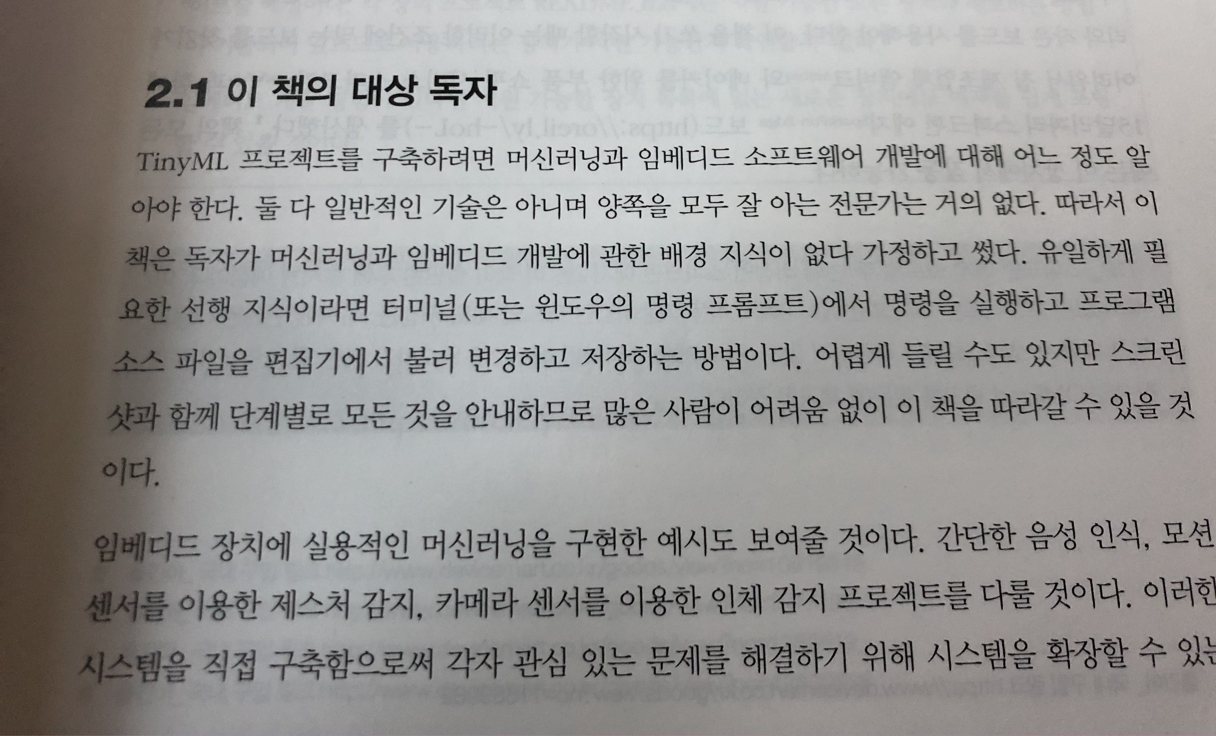 아두이노와 같은 보드들이 저렴한 가격으로 IOT가 활발해지고 있는데, 거기에 ML을 적용한다면 세상은 지금도 빠르게 발전하고 있지만, 거기에 더욱 가속을 할 수 있을 것 같습니다. IOT, 임베디드에 관심이 있는 사람과 ML에 익숙하신 분들에게 큰 도움이 될 수 있을 것 같습니다. 다른 입문서는 아직 보지 않아서 모르겠지만, ML 입문서로도 괜찮을 것 같습니다.