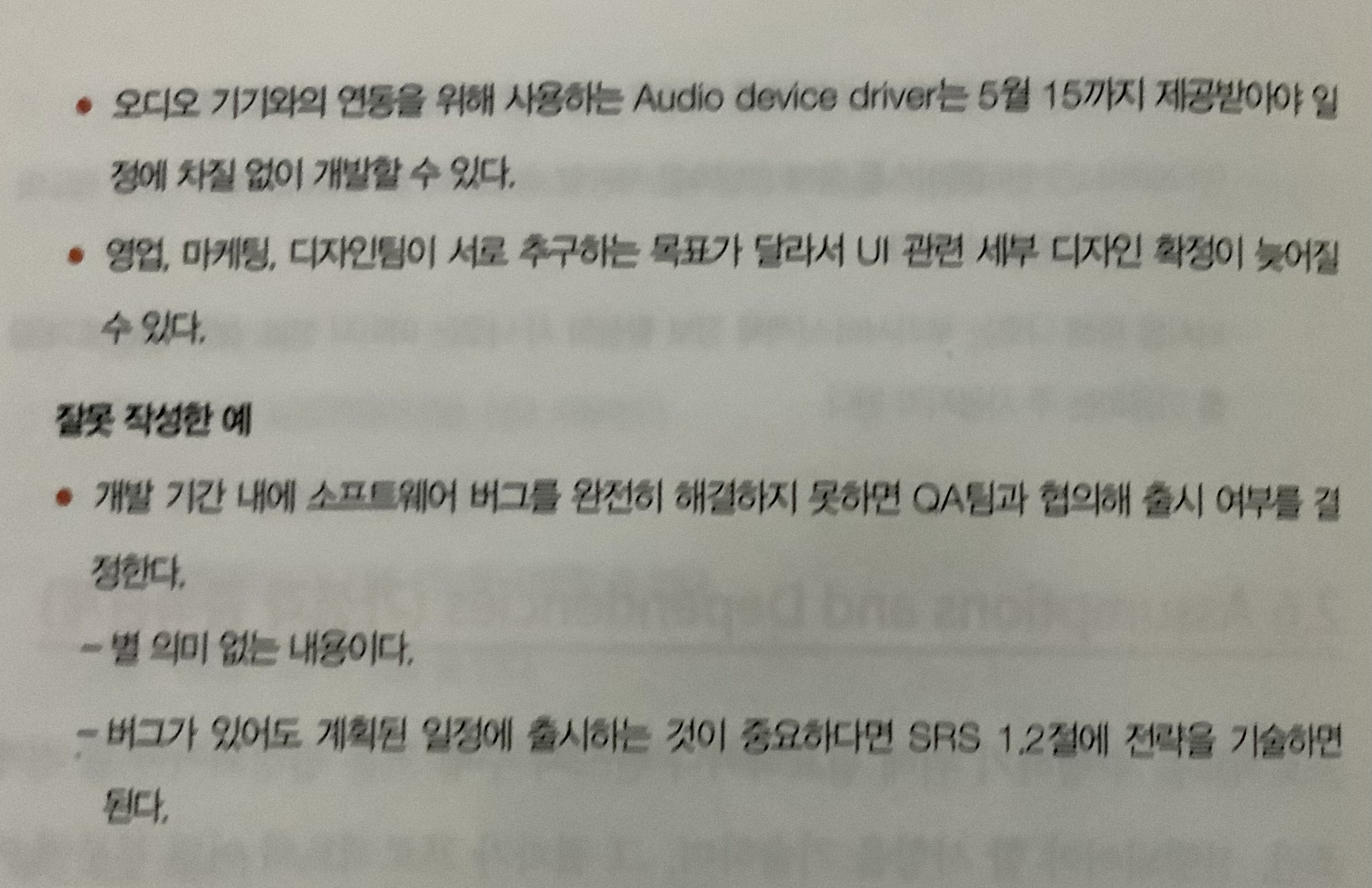 실제 SRS 를 챕터별로 설명하고 잘 작성한 예와 잘못 작성한 예를 들어 설명해줍니다.